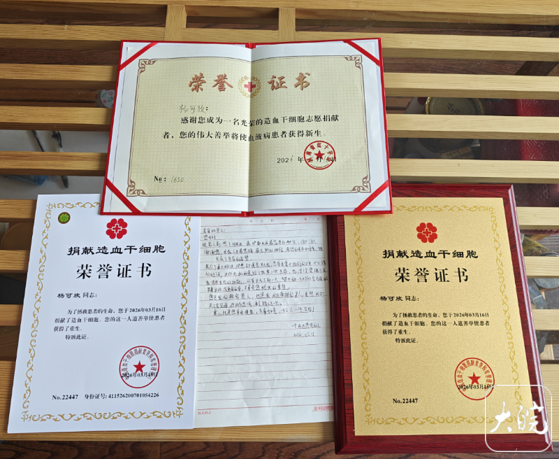 杨可欣收到的造血干细胞捐献荣誉证书及感谢信