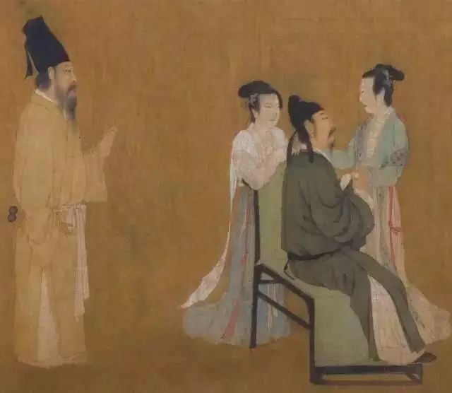 经过一番击鼓伴舞,疲惫了的韩熙载套上外袍,在四位家伎的簇拥下躺在内室的卧榻上。旁边的爱姬王室山递来盆,韩一边用手指轻轻沾水洗手,一边和姑娘们交谈。