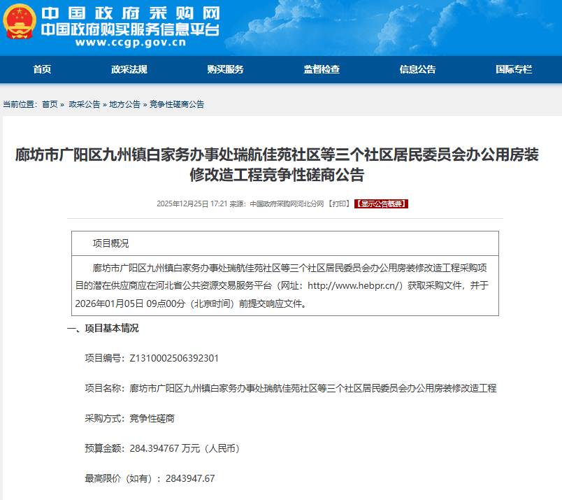 据中国政府采购网官网显示,廊坊市广阳区九州镇白家务办事处瑞航佳苑社区等三个社区居民委员会办公用房装修改造工程竞争性磋商公告于2025年12月25日发布,项目编号为Z1310002506392301,预算金额为284.394767万元(人民币),最高限价(如有):2843947.67。