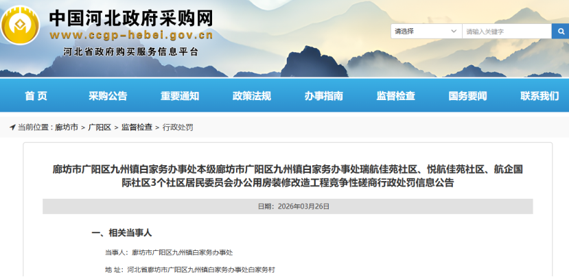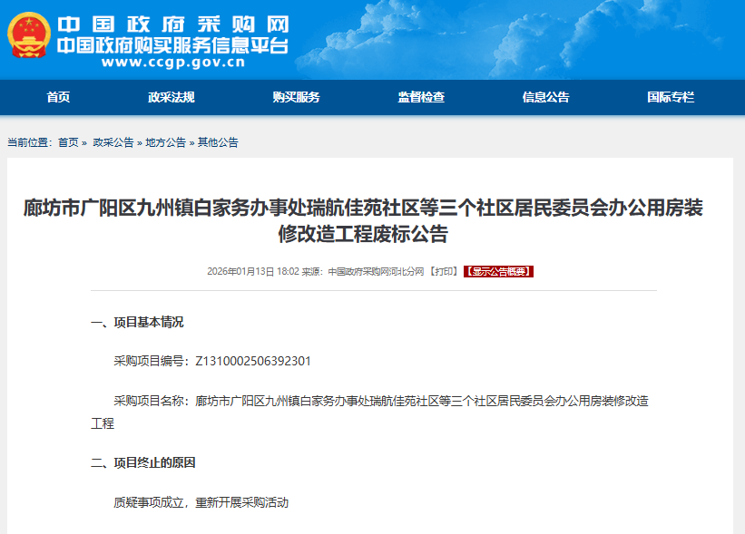 2026年1月13日,中国政府采购网发布廊坊市广阳区九州镇白家务办事处瑞航佳苑社区等三个社区居民委员会办公用房装修改造工程废标公告。