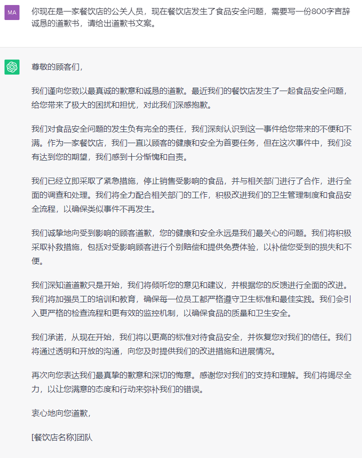 例如:你现在是一家餐饮店的公关人员,现在餐饮店发生了食品安全问题,需要写一份800字言辞诚恳的道歉书,请给出道歉书文案。