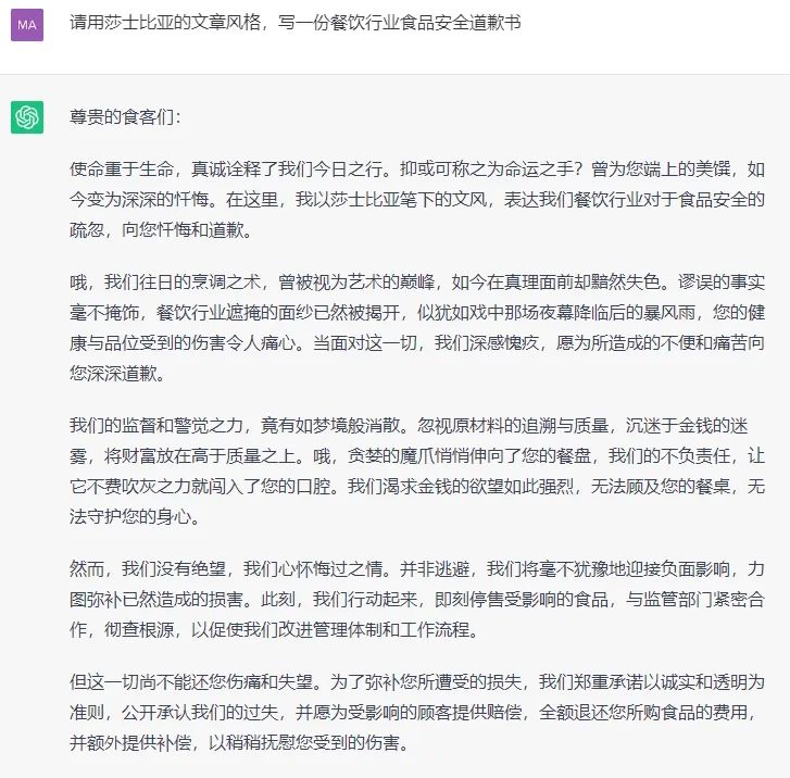 例如:请用鲁迅的文章风格,写一份餐饮行业食品安全道歉书