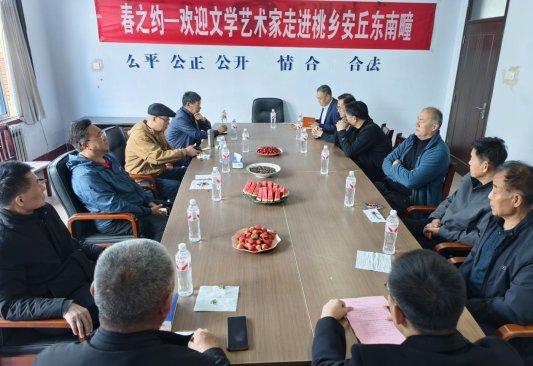 采风活动开始前,作家们与凌河镇红沙沟生态园区及东南疃村的负责同志进行了坐谈,坐谈会由中国作协会员赵志友主持,中国自然资源作家协会网络创作委员会主任张世奇讲了这次采风活动的目的,中国作协会员黄旭升谈了对生态农业发展的看法,园区负责人与东南疃村负责人分别介绍了当地生态农业的发展情况。