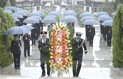 3月31日,大雨。西湖区40多名青年民辅警来到杭州革命烈士陵园,向他们的战友金晓军敬献花篮。