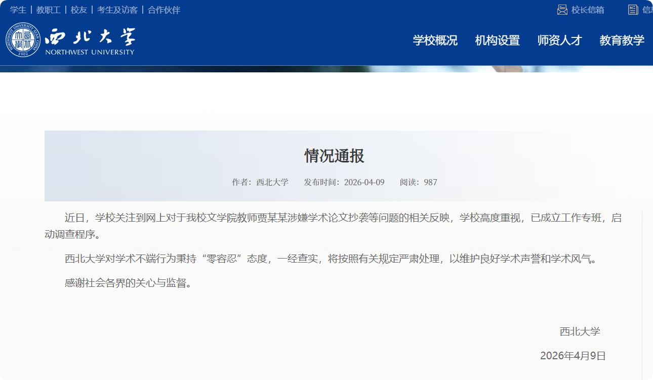 通报称,近日,西北大学关注到网上对于该校文学院教师贾某某涉嫌学术论文抄袭等问题的相关反映,学校高度重视,已成立工作专班,启动调查程序。