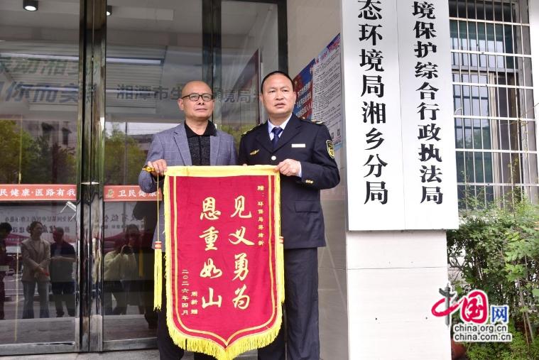 4月8日,湘潭市生态环境局湘乡分局上演暖心一幕,市民周先生专程送来锦旗,紧紧的握住蒋绪新的手,眼眶泛红,声音哽咽:“感谢你救了我女儿,你是我全家的恩人!”