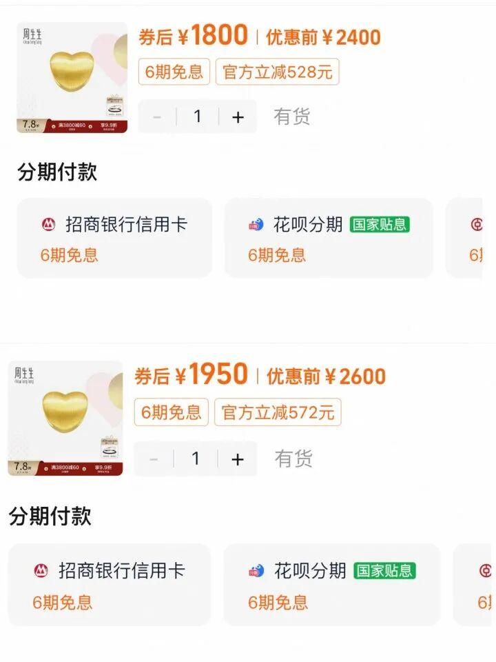 0.7克左右的爱心转运珠,昨天原价2600元,券后1950元;今天原价降至2400元,券后1800元,又便宜了150元。