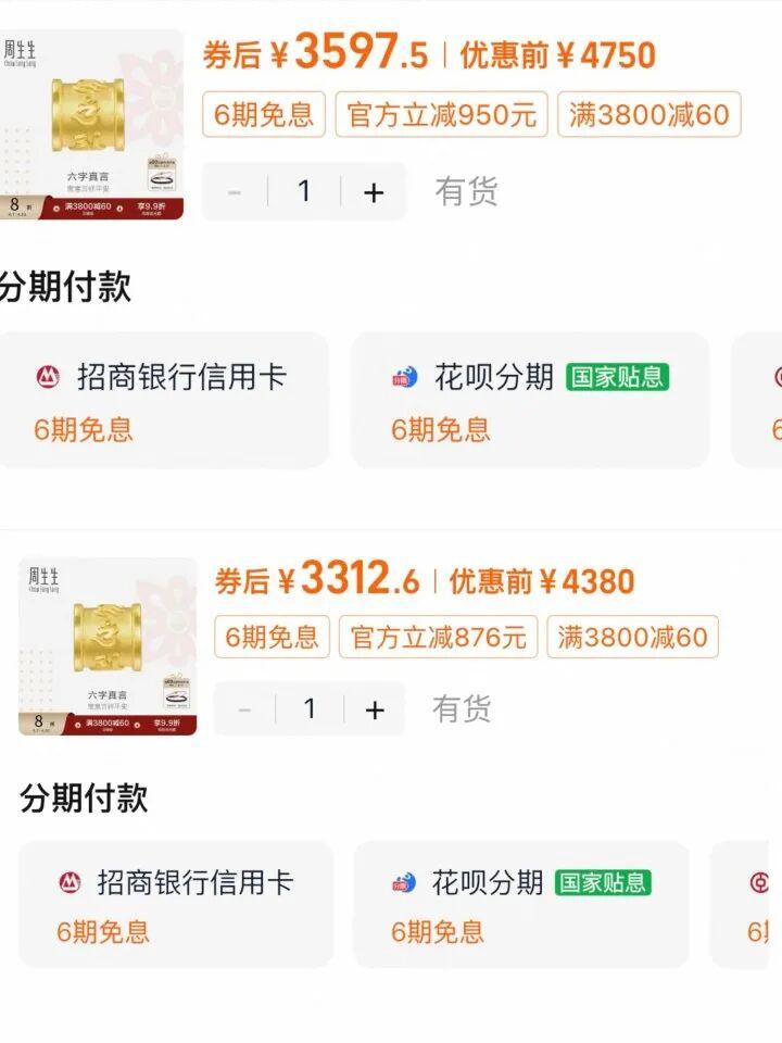 六字真言款原价4750元,折后3597元;今天原价降至4380元,折后3312元,降了近300元。