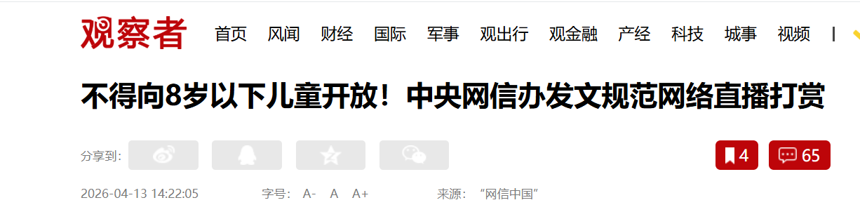 不得向8岁以下提供打赏服务!中央网信办发文规范直播打赏