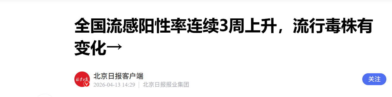根据中国疾控中心近期发布的全国急性呼吸道传染病哨点监测情况,全国流感病毒检测阳性率连续3周上升。