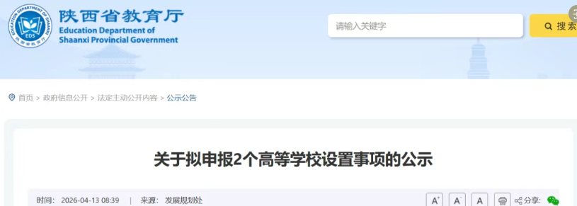 华商网讯 4月13日,陕西省教育厅网站发布,关于拟申报2个高等学校设置事项的公示,具体内容如下: